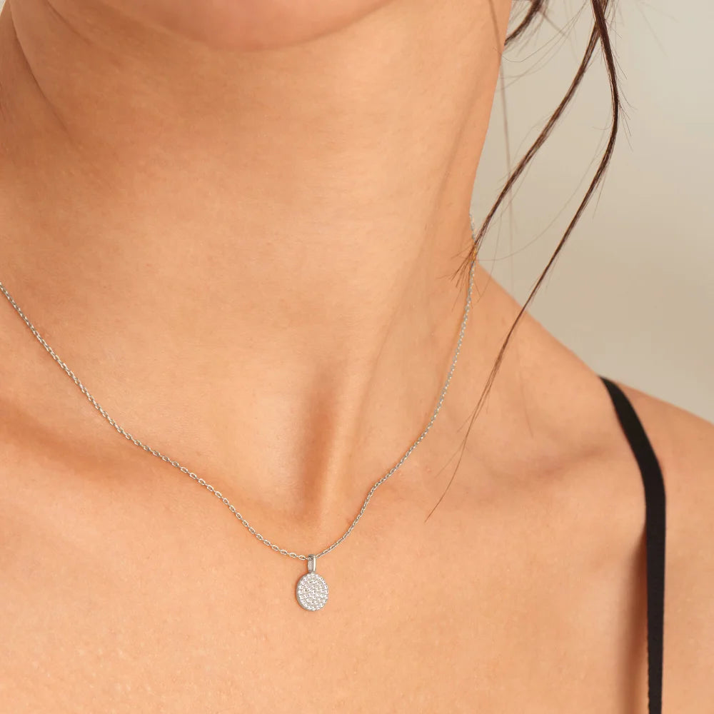 We’ve taken glam to the next level this season with our cubic zirconia necklace, complete with a sparkle encrusted disc pendant. Sitting on a classic delicate chain, the stunning round pendant is encircled with rows of shimmering stones. A statement piece on its own but also perfect to layer with your favorite delicate silver chains. The necklace is made of sterling silver. The necklace is adjustable and it can be worn at 16 to 18 inches in length. We will provide a pendant box.