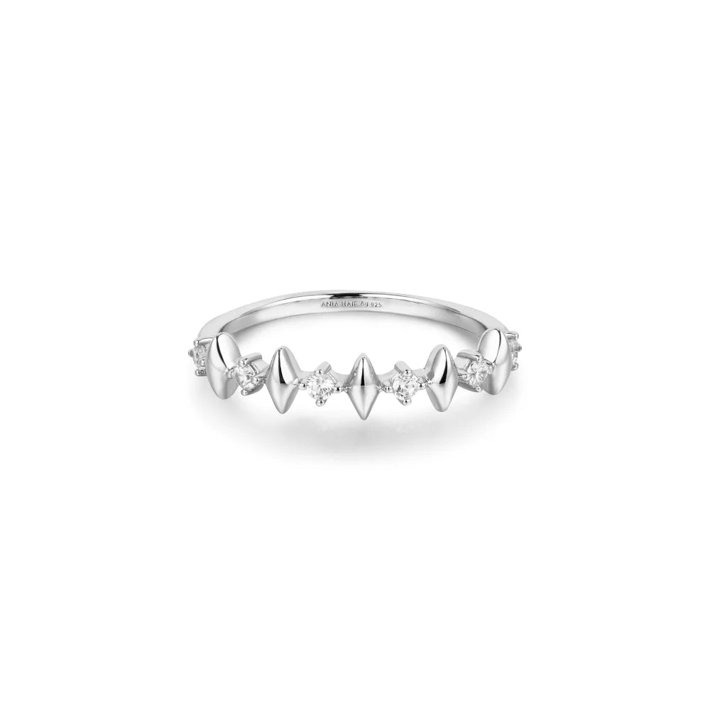 Embellished with subtle cubic zirconia stones, this unique ring is inspired by Art Deco, employing rich, bold classical ornamentation. Wear alone or layer up with coordinating rings for a trendy style. The ring is made of sterling silver and is a finger size 6 3/4. We will provide a ring box.