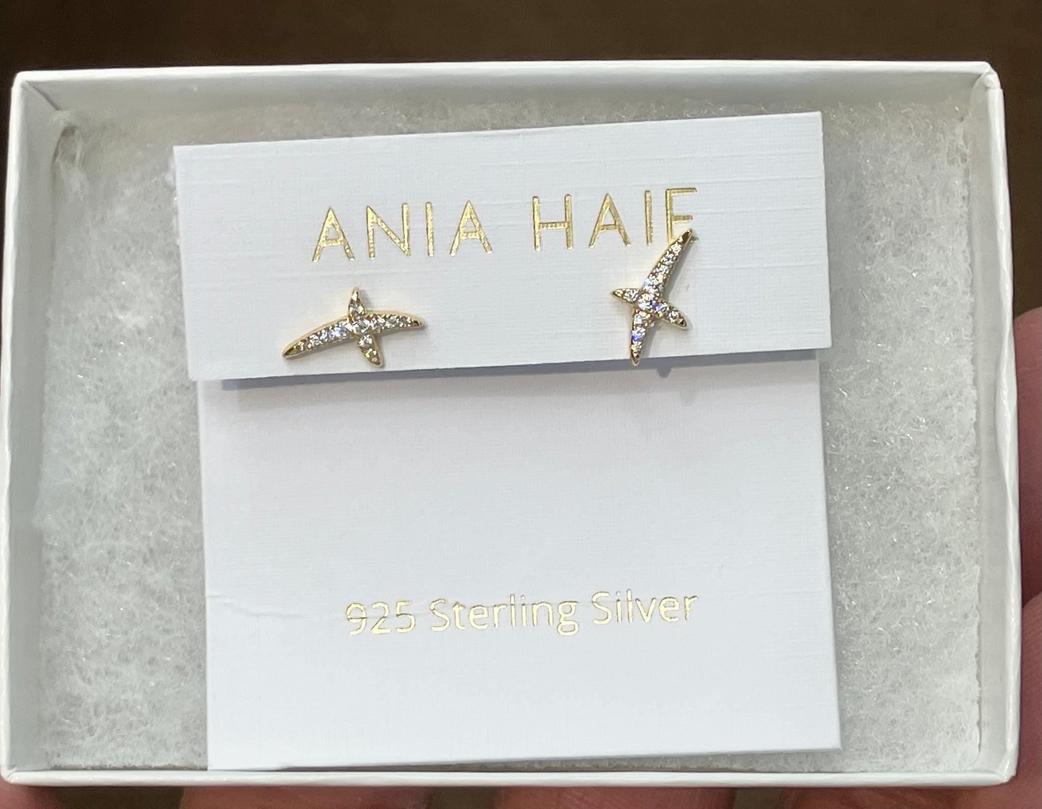 These shimmering stud earrings with their irregular cross shape, make these a perfect choice to symbolize your individuality. Pair with a chunky hoop and sparkling studs to create a look sure to exude glamour. The earrings measure 11.5x 6.4 millimeters There are 10 round cubic zirconia stones set in each earring. The earrings are made of sterling silver and are 14k gold plated. We will provide a box.