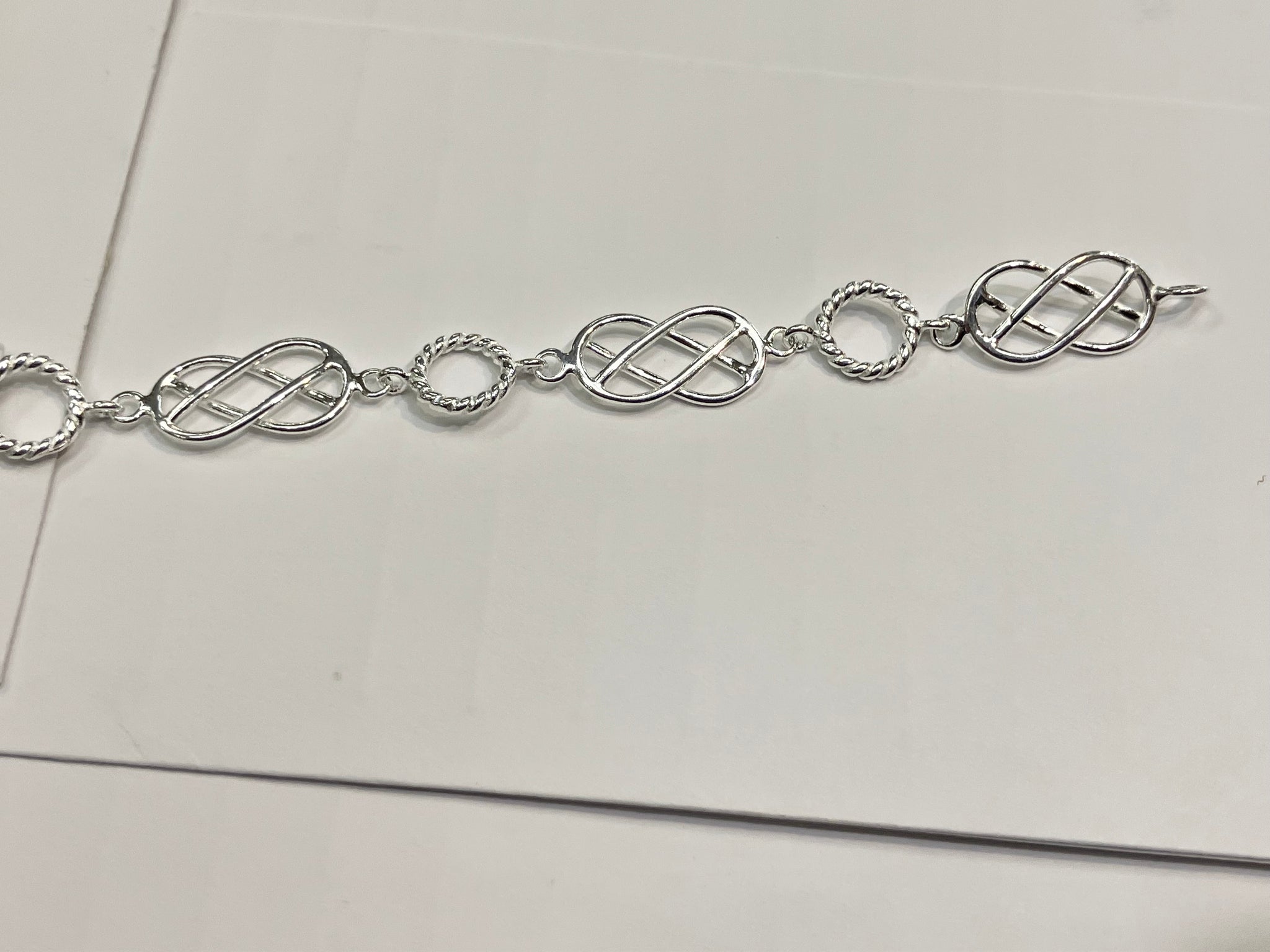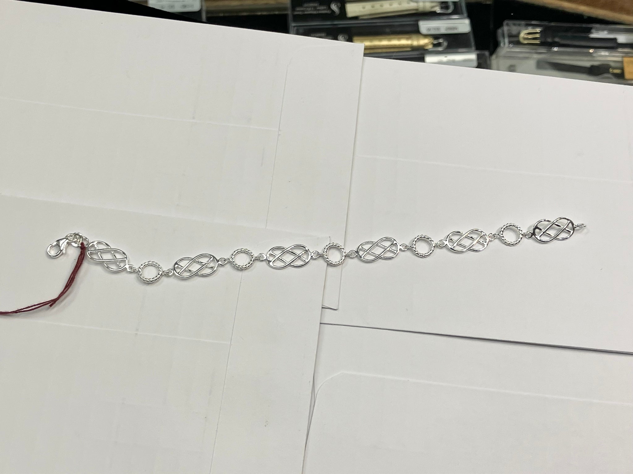 The item is a sterling silver 7.25 inch long bracelet. The bracelet measures 8 millimeters wide and weighs 4.6 grams. The bracelet has a lobster claw catch. We will provide a bracelet box.
