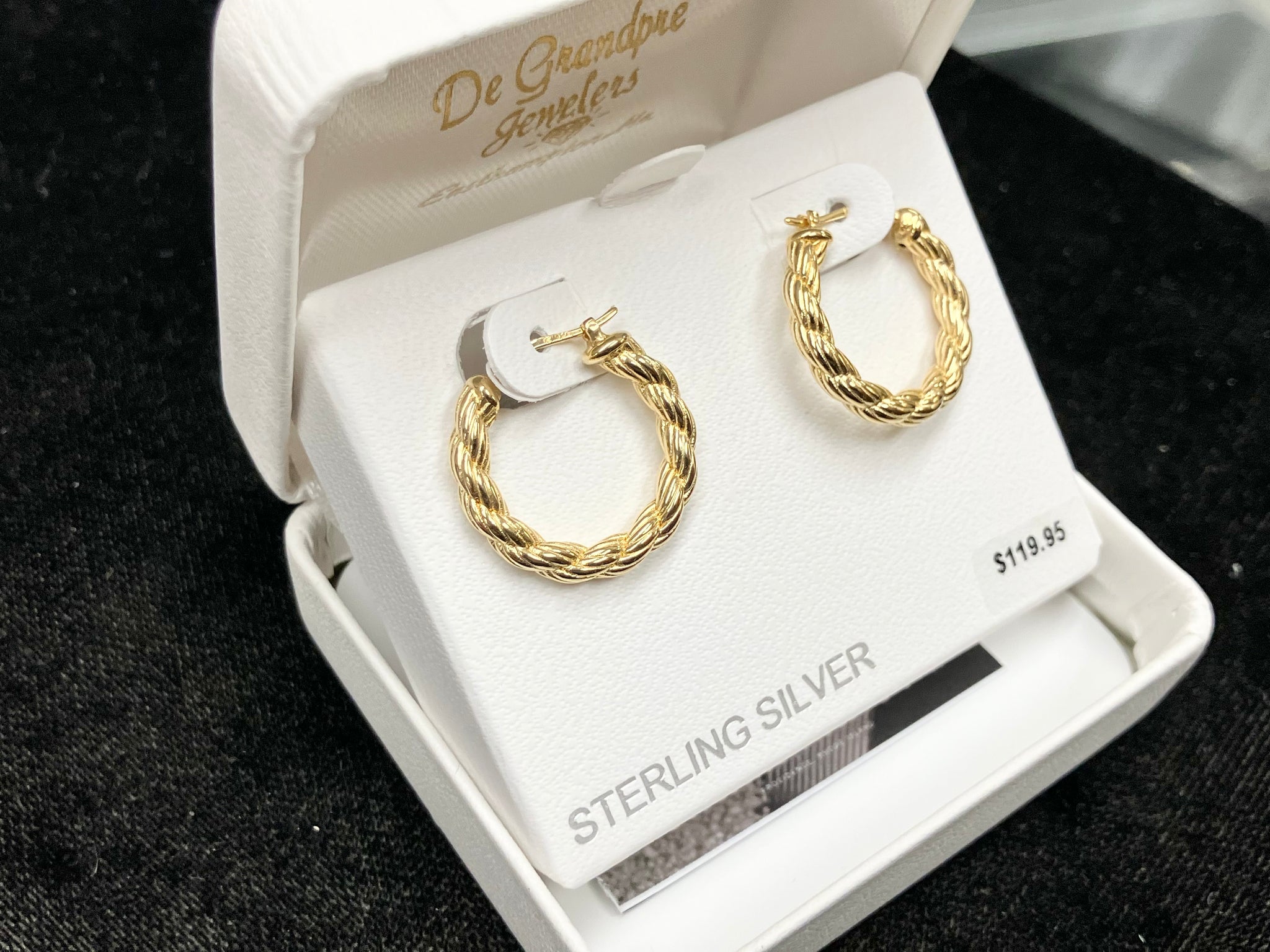 The earrings are made of sterling silver and are plated with 22k gold. The earrings measure 3 x 20 millimeters and weigh 1.96 grams. We will provide a earring box.