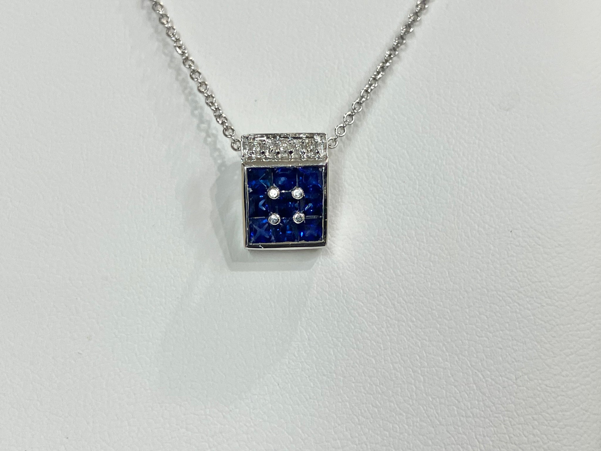 The item is a 14k white gold sapphire and diamond pendant. The pendant consists of 9 princess cut dark blue sapphires and 3 natural round diamonds. The diamonds have a G color and an I1 clarity grading and weigh .04 carats total weight. The sapphires weigh 1.00 carats total weight. The pendant measures 11.5 x 8.5 millimeters. The cable link chain has a spring ring catch. We will provide a pendant box. If you are ordering outside of the United States please check with your local post office to see if you will have to pay any customs fees or import taxes.