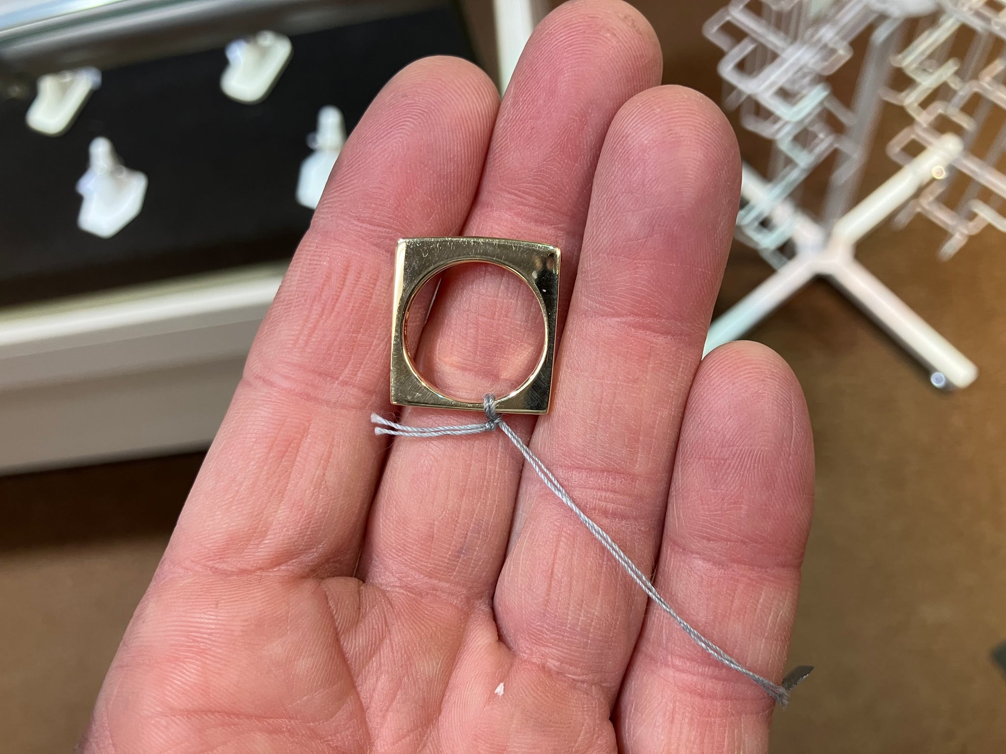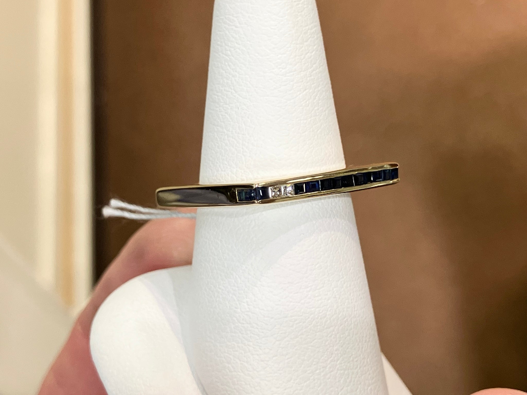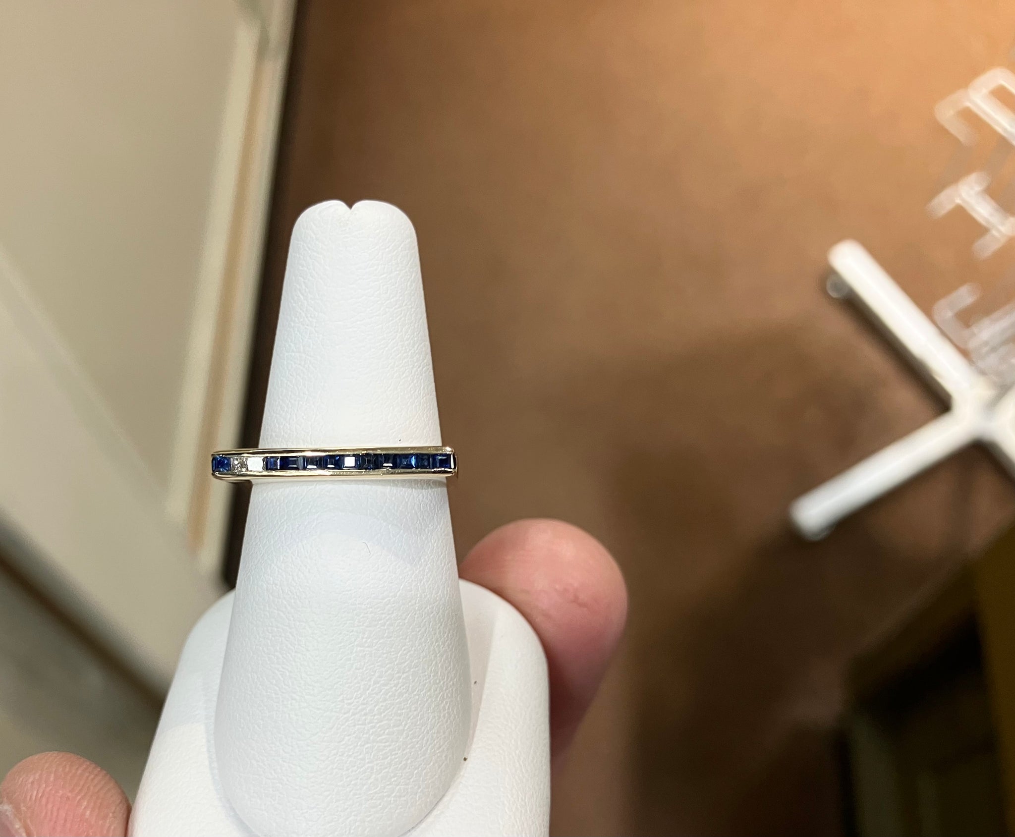 The item is a 14k yellow gold natural sapphire and diamond ring. The ring consists of 15 princess cut blue sapphires that measures approximately 1x1 millimeter each. The sapphires weigh 1.49 carats total weight. There are 2 princess cut diamonds set in the ring. The diamonds weigh 0.02 carats total weight. The diamonds have a G color and an SI2 clarity grading. All the stones are channel set. Four of the sapphires are set on the side of the ring , two each side. The ring lays flat on its side like a coin. The ring measures 2.5 millimeters wide and weighs 5.1 grams. The ring is a finger size 6 3/4. We will provide a ring box. If ordering outside of the United States please check with your local post office to see if you will have to pay customs or import taxes.