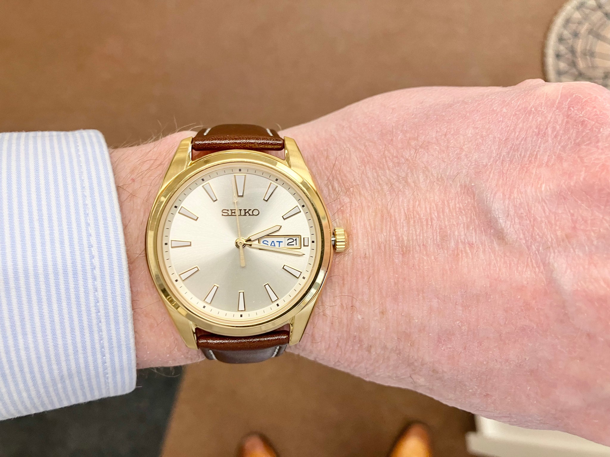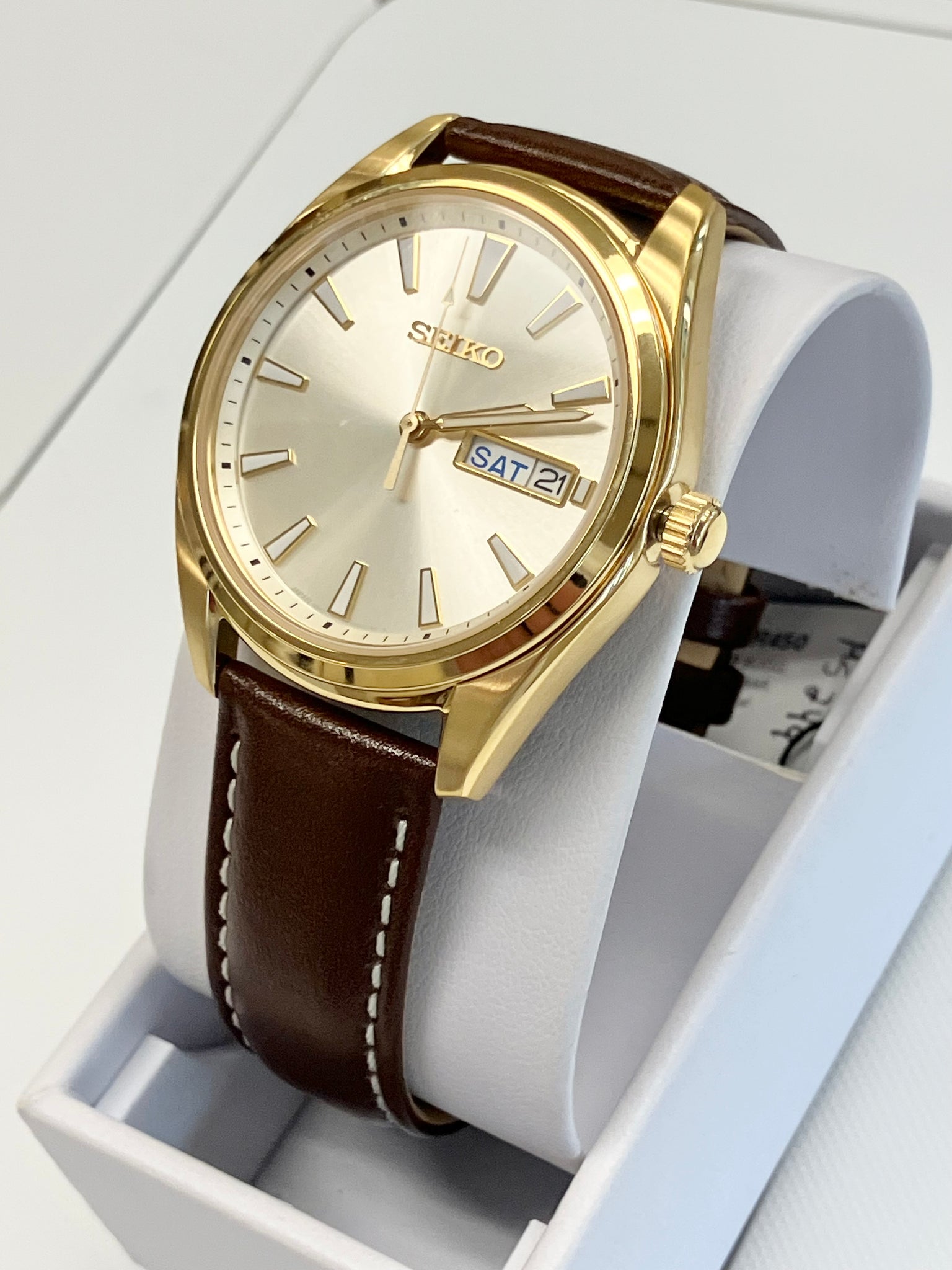 From the Essentials Collection. Offering classic dress/sport designs, in two sizes to suit anyone’s personal style, the Essentials Collection provides the ideal solution for everyday wear. Crafted of stainless steel with gold-finish and a scratch-resistant sapphire crystal, this perfectly balanced design features a contemporary minimalist light champagne sunray dial with gold accents, day/date calendar, and LumiBrite hands and markers for superior visibility. To complete the tailored look, the brown leather strap includes contrast stitching. 10 bar, 100M Water Resistant. The watch measures 40.2 millimeters wide and 8.37 millimeters thick. The lug width is 20 millimeters. We will provide the watch box along with the three year warranty card.