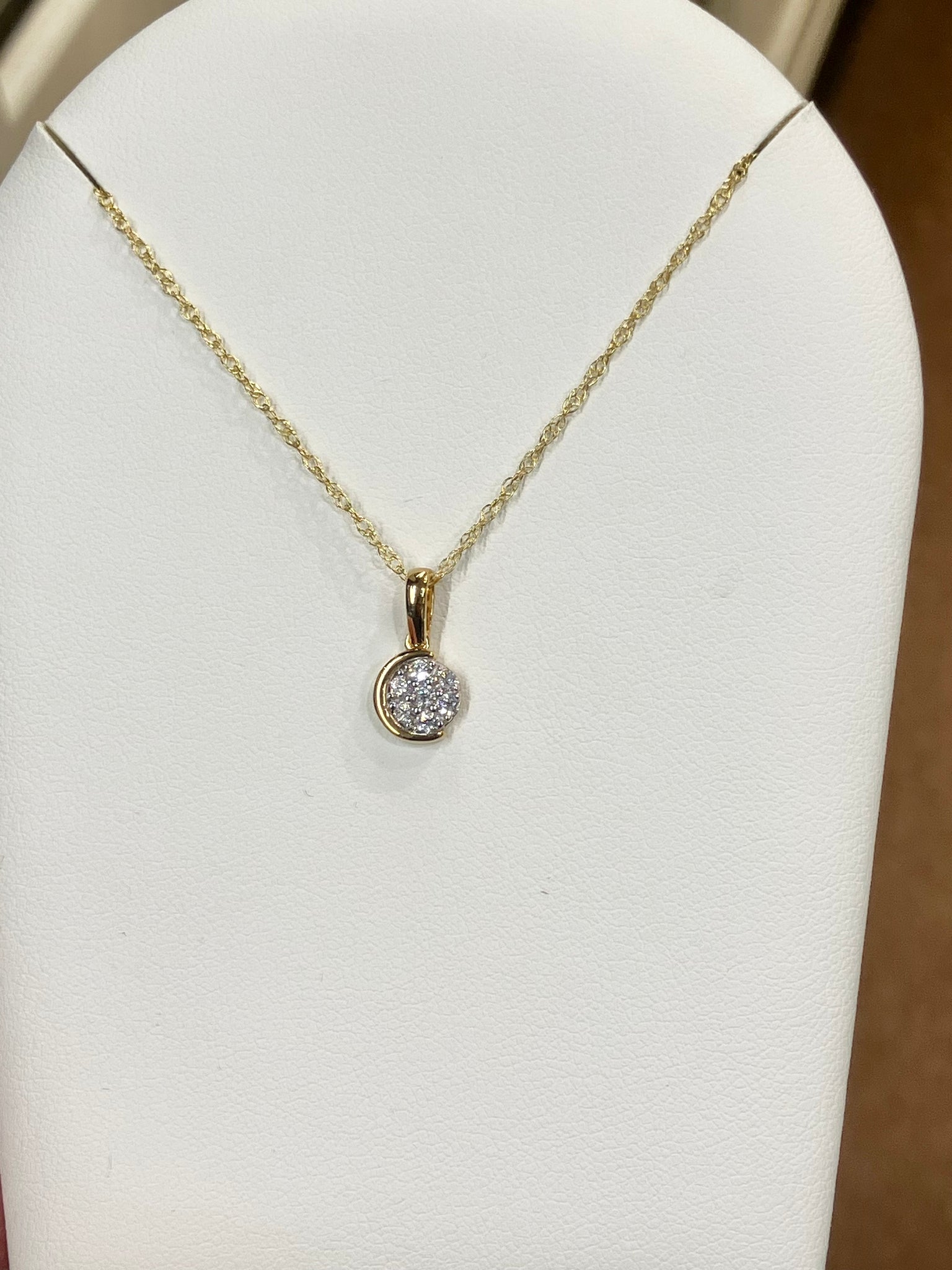 The item is a sterling silver 18k yellow gold plated over sterling silver lab diamond pedant with a 18 inch long rope chain. The chain has a lobster claw catch. The pendant consists of 7 round lab grown diamonds that are pave set. The diamonds have a G color and an SI1 clarity grading. The diamonds weigh 0.16 carats total weight. We will provide a pendant box. If you are ordering outside of the United States please check with your local post office to determine if you will have to pay customs fees.