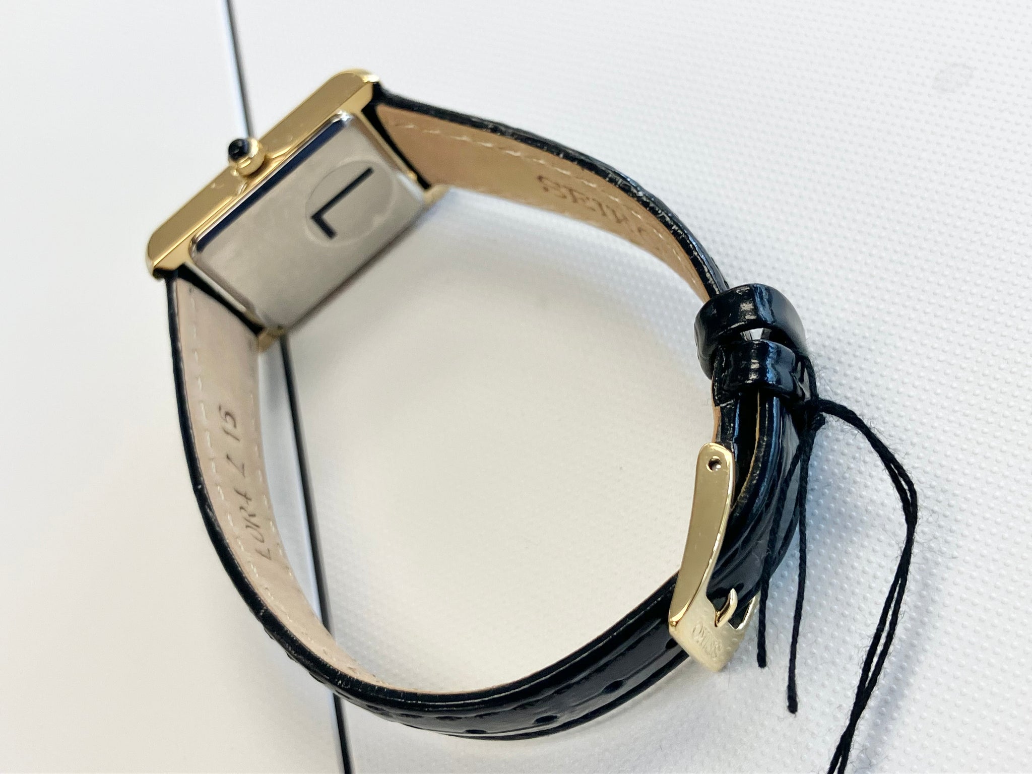 The item is a stainless steel women's Seiko watch that has a gold color tone and a white dial with black roman numerals. The watch has a black leather strap and a black cabochon stone crown. The watch has a sapphire crystal. The case back snaps closed. The watch is water resistant. The watch is battery powered. We will provide the watch box and three year warranty card.