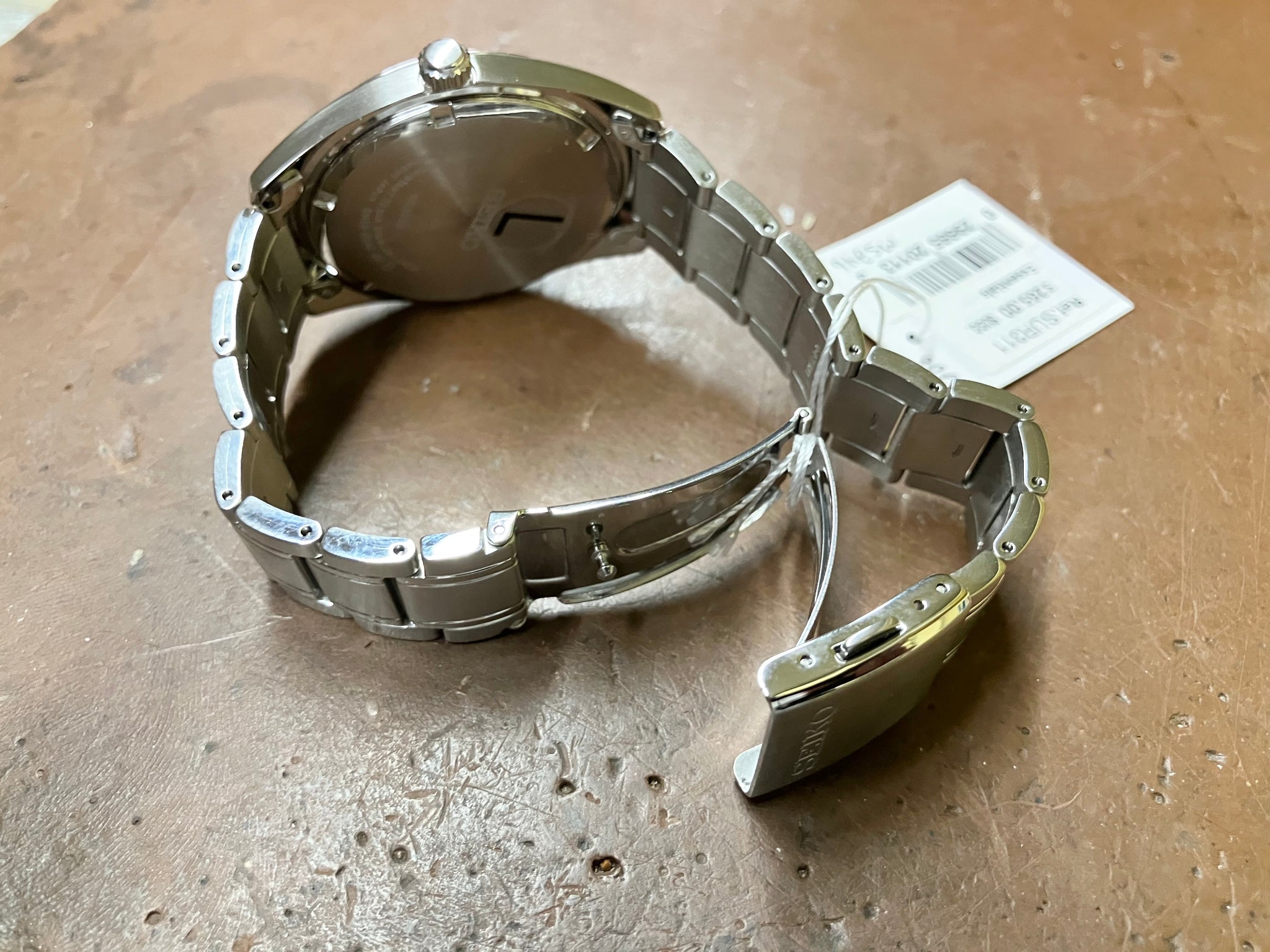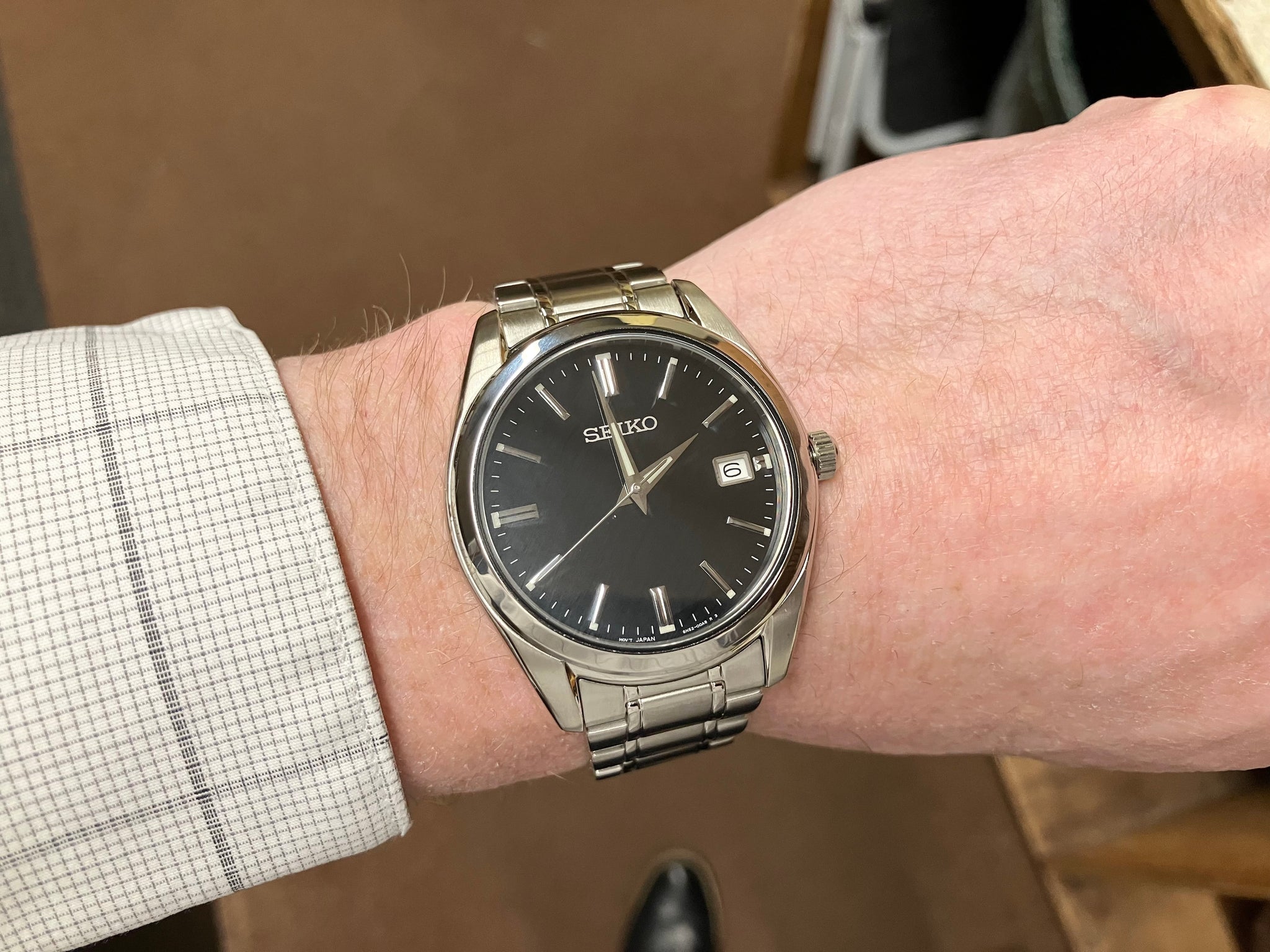 The item is a stainless steel men's Seiko watch from the Essentials collection. The case measures 8.4 millimeter thick and 40.2 mm wide. The lug width is 20 millimeters. The watch has a black dial with lumibrite hands and markers. There is also I date window located at the 3 position. The watch weighs 113 grams and is water resistant up to 10 bar. The watch has a screw case back. The watch has 15 second per month precision. The quartz watch runs on a battery that should last approximately 3 years. The band has a three-fold clasp with a push button release. The watch will come with a box and the three year warranty card.