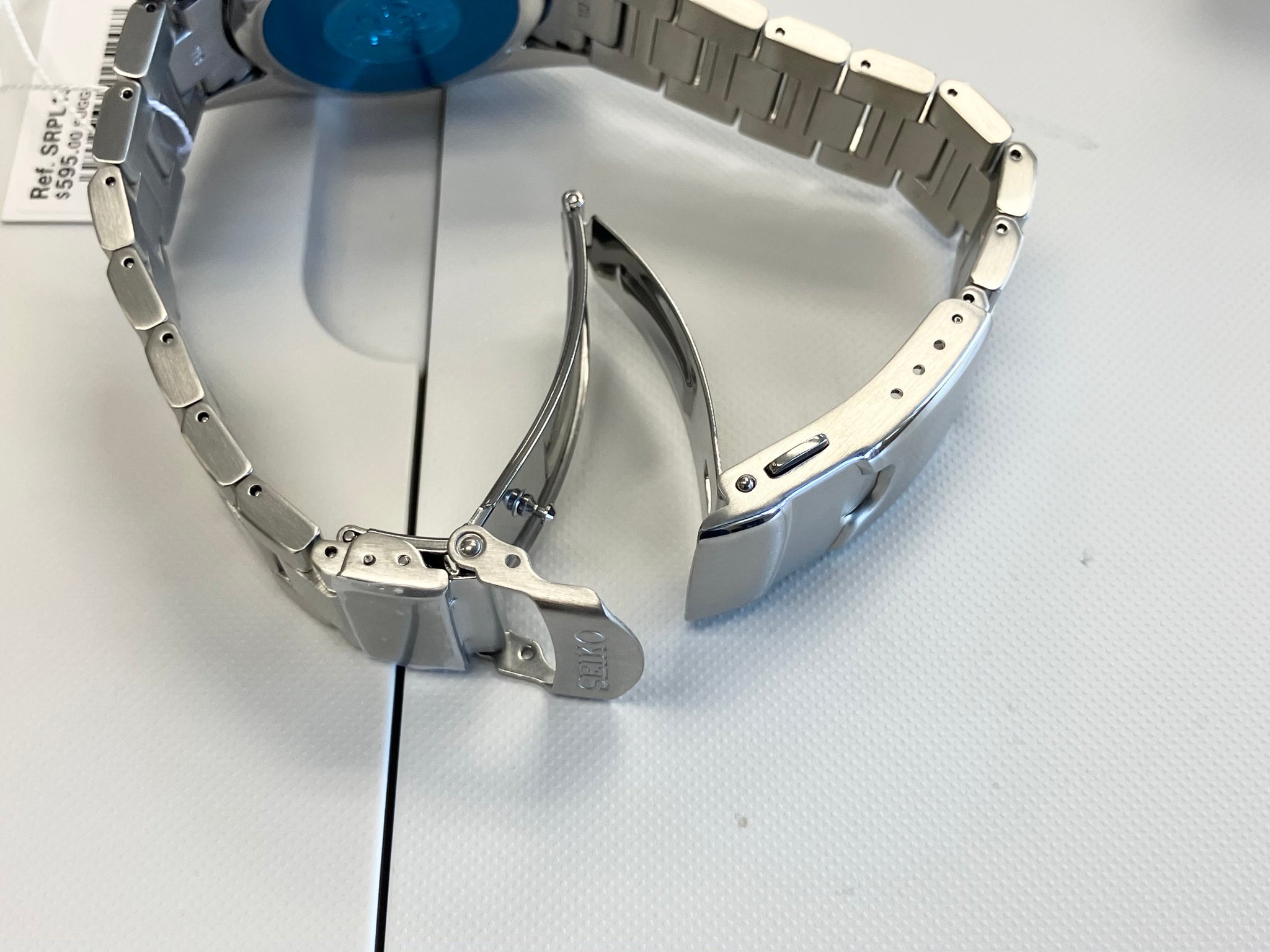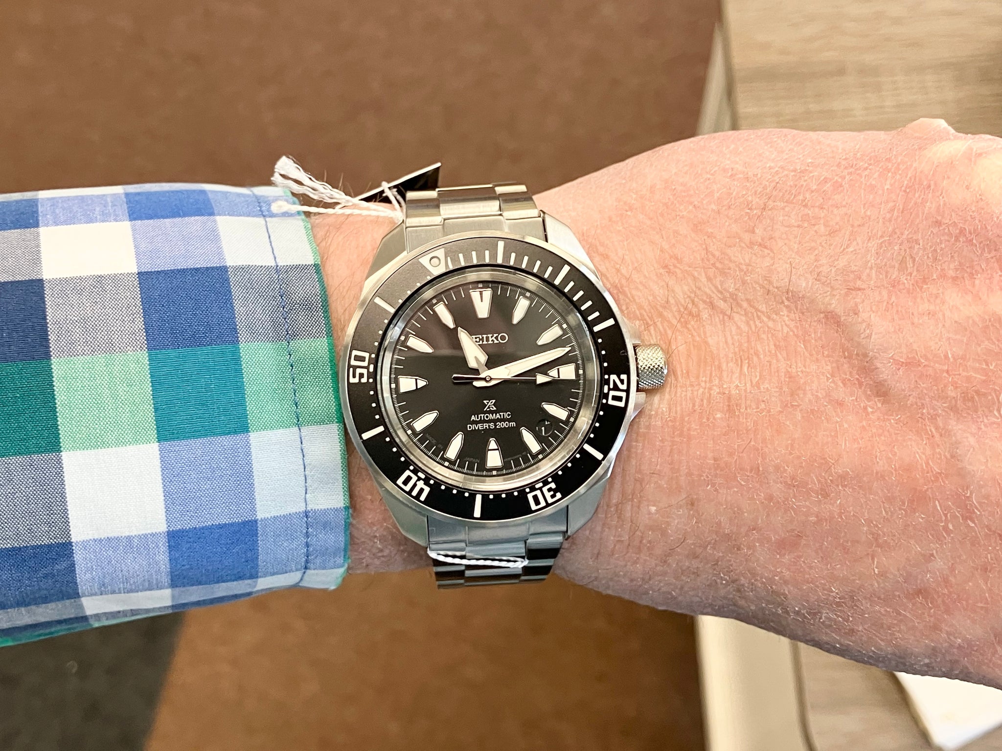 Prospex Automatic Diver. Designed for those who treat life as the ultimate adventure, the Seiko Prospex line meets every challenge with technological excellence and winning design. Inspired by Seiko’s most iconic diving styles, the case retains the straight contour of the original design with a sharpness enhanced by a sleeker more compact profile. For reliable timing in rough waters, the 23-jewel automatic movement beats at a frequency of 21,600 vibrations per hour, with a power reserve of approximately 41 hours, and can be wound manually or automatically. Framed by a black uni-directional rotating elapsed timing bezel, the black dial features a date calendar and LumiBrite hands and markers. Crafted of stainless steel, this high-intensity timepiece follows ISO standards for scuba diving and is equipped with a secure screwdown crown and caseback and a tri-fold push button release clasp with secure lock and extender. 200m Water Resistant. The case measures 41.7 millimeters in diameter and 12.3 millimeters thick. The lug width is 20 millimeters. We will provide the box and warranty paper work.
