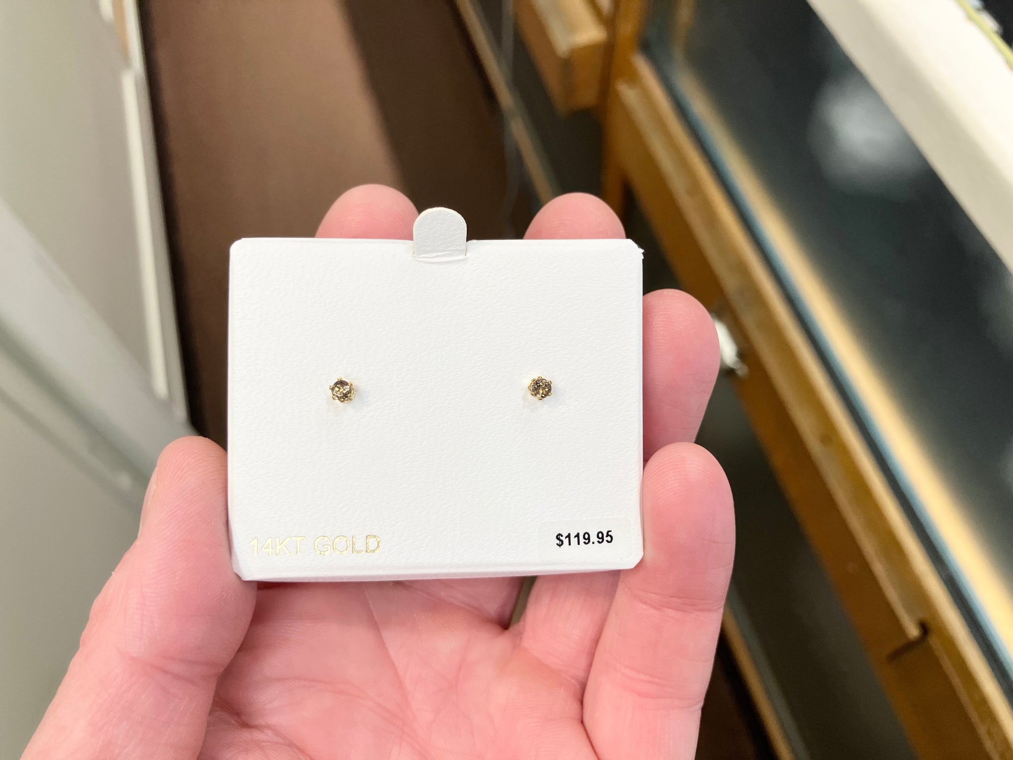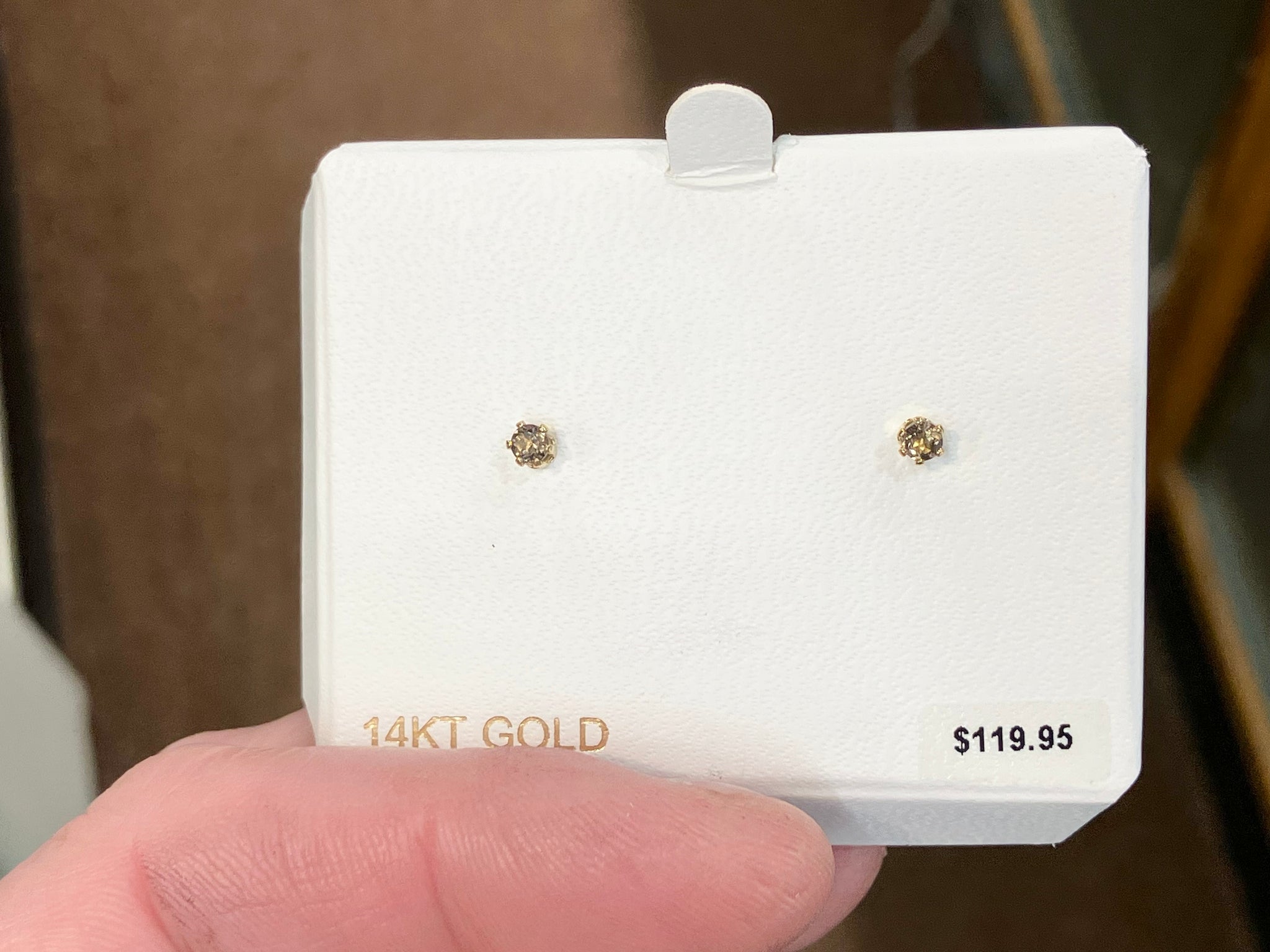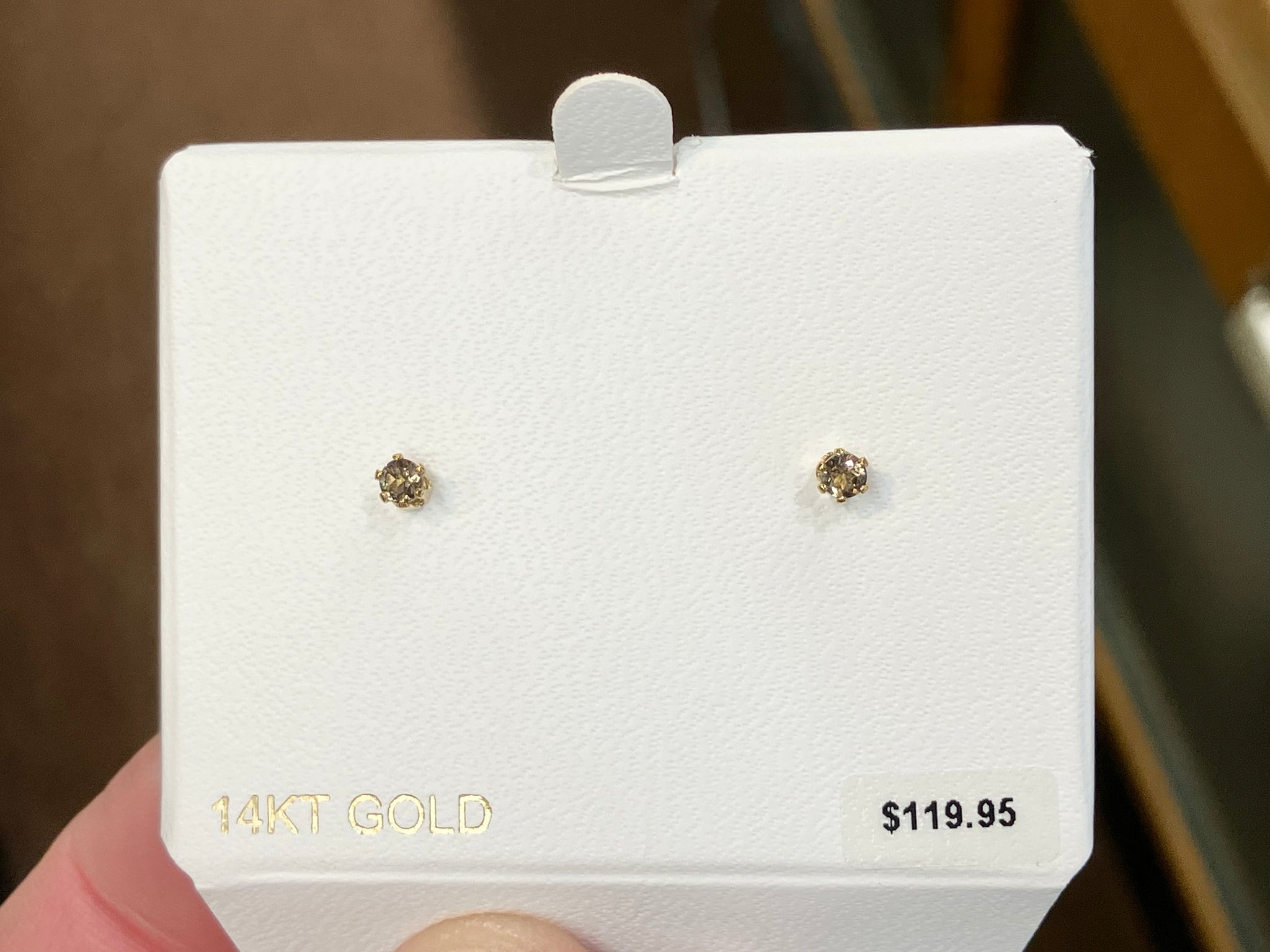 The earrings are made of 14k yellow gold. Each earring has a 3 millimeter round smoky quartz set inside six prongs. The earring posts and backs are also 14k yellow gold. We will provide a earring box. If you are ordering from outside of the United States please check with your local post office to see if you will have to pay customs fees.